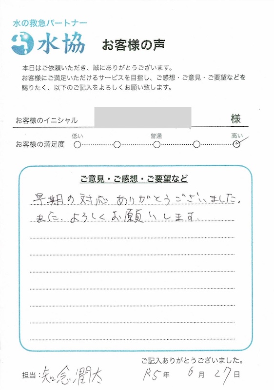 急な水漏れでお困りのところ、迅速に修理でき、お役に立ててよかったです。