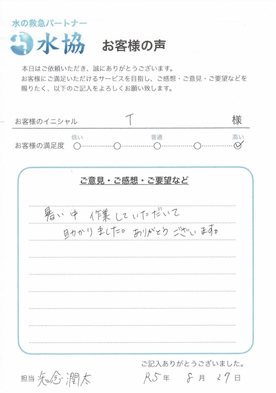 洗面台の詰まりを除去するとともに、トラップの交換をさせていただき、安心してご利用いただけるようになったと思います。水協では事前の説明やお見積もりの提示を徹底し、お客様に安心してご依頼いただけるよう務めております。また何かお困りの際にはいつでもお気軽にお声掛けいただければ幸いです。