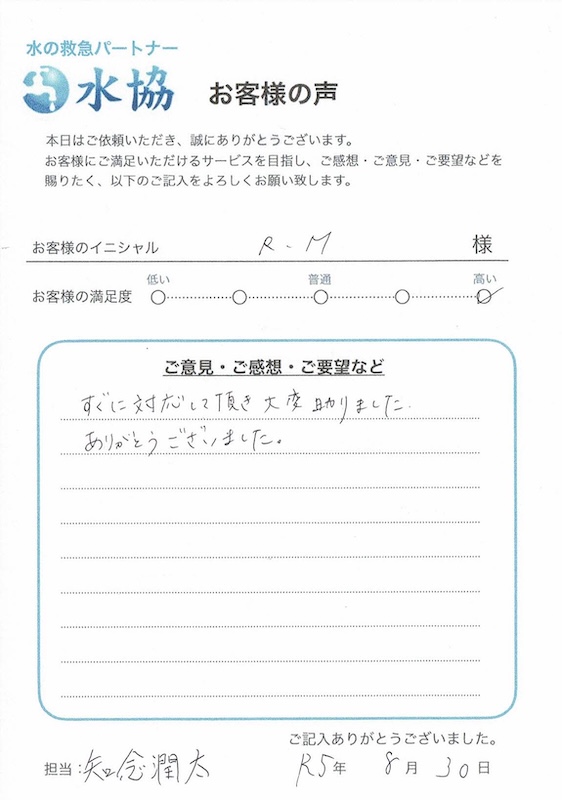 夜間のトイレのトラブルでお困りだったと思いますが、即日対応でき、無事解決してよかったです。